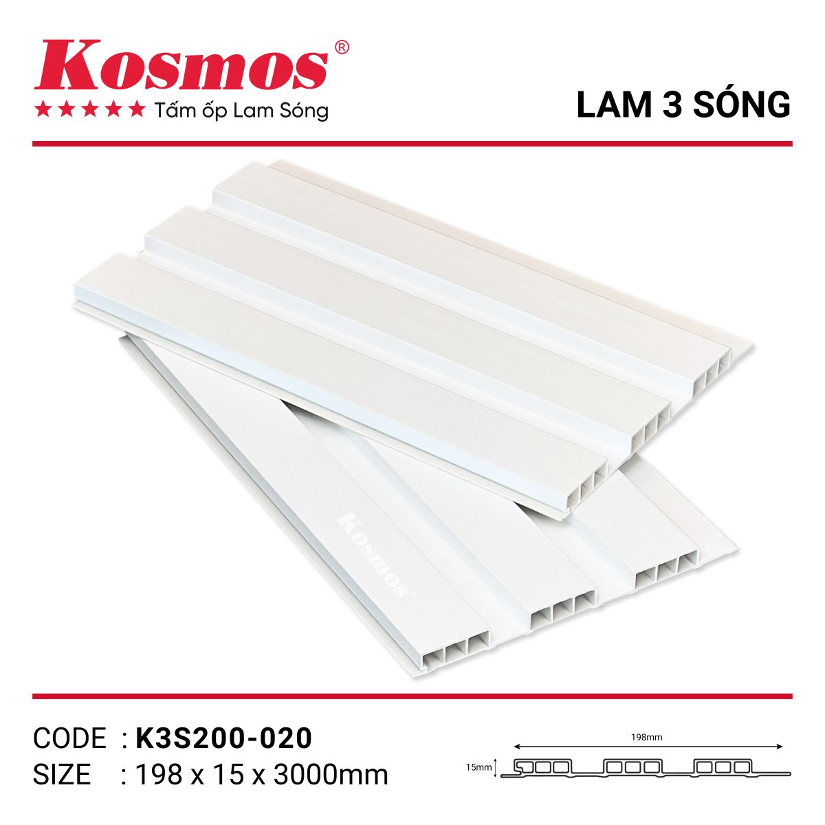 Lam sóng K3S200-020 Kosmos là một trong những mẫu lam sóng PVC nổi bật thuộc dòng sản phẩm cao cấp của thương hiệu Kosmos. Với thiết kế 3 sóng mềm mại, hiện đại cùng màu sắc vân gỗ sang trọng, sản phẩm mang đến vẻ đẹp tinh tế, phù hợp với nhiều phong cách nội thất từ cổ điển đến hiện đại.